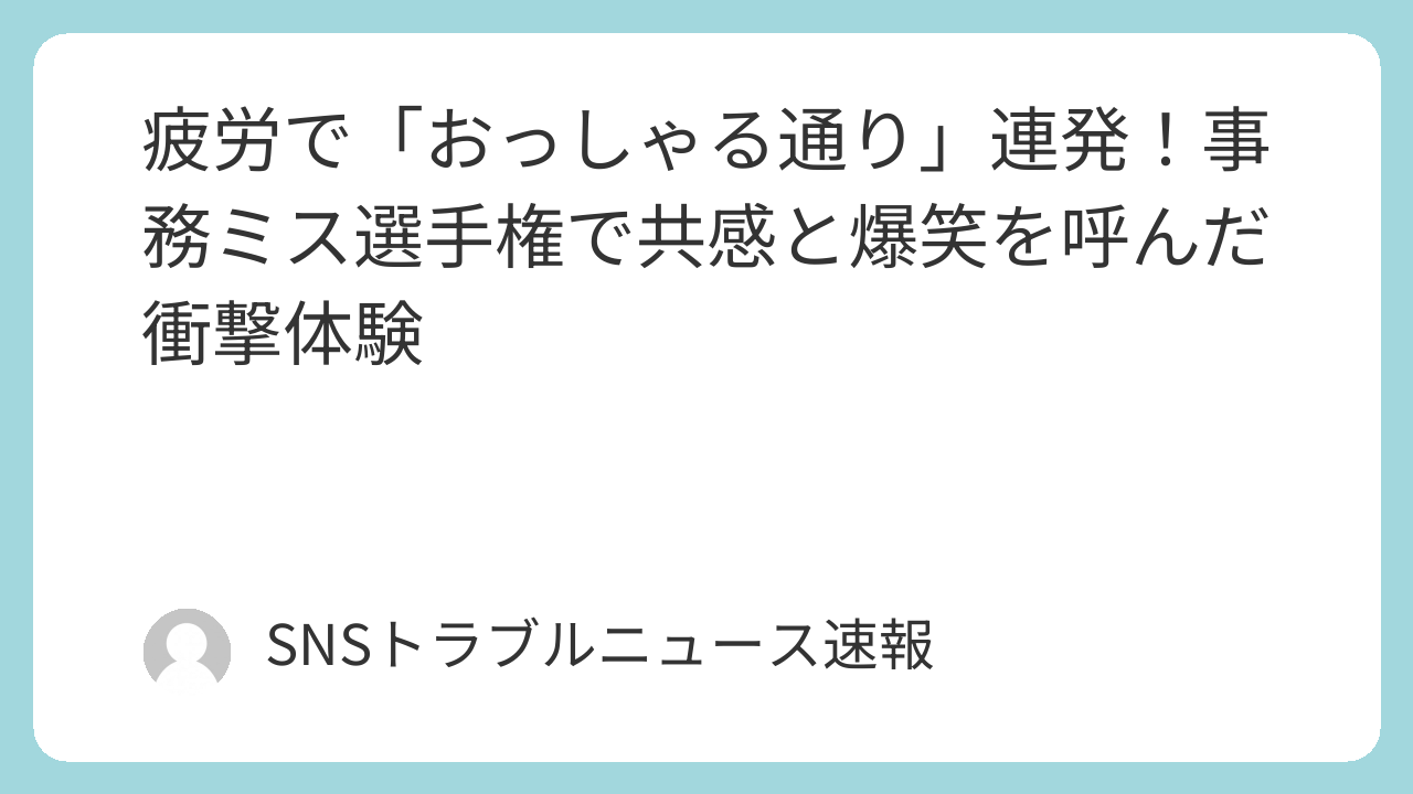 ねえねえ、最近Twitterでバズってた「事務ミス選手権」って知ってる? 「のり弁」さんっていう方がね、「長時間の電話クレームに疲れ果てた私。 :私がおかしいとでも言うのか⚪︎×+%$€>£~ 私:おっしゃる通りでございます。 〜end〜 事務ミス選手権」って投稿したら、もう共感と爆笑の嵐だったんだ。このたった数行の投稿に、なんで私たちはこんなにも心揺さぶられるんだろうね?