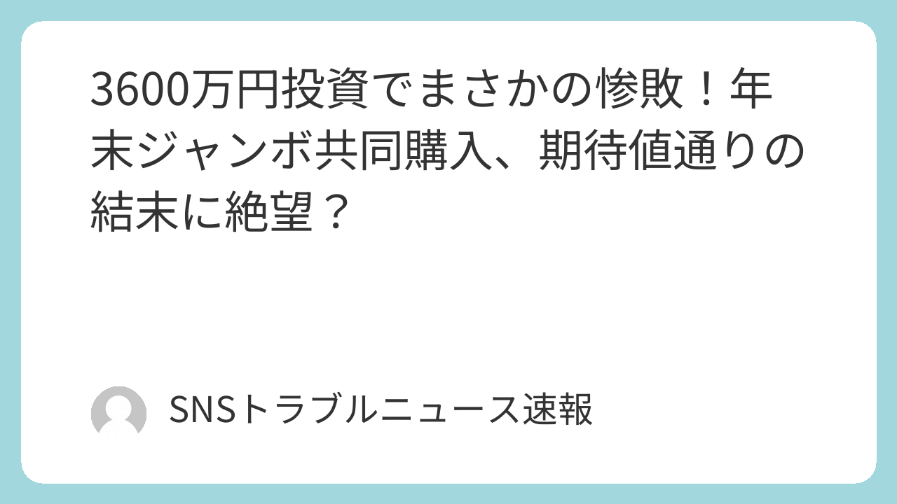 こんにちは!突然ですが、あなたは宝くじを買ったことがありますか?「夢を買う」なんてよく言われますが、その「夢」の正体って一体何なのでしょうね?今回ご紹介するのは、ごはっちゅうちゃんさんが企画された、年末ジャンボ宝くじの共同購入プロジェクト。なんと総額3,599万円もの大金が投じられ、約12万枚もの宝くじが購入されたそうなんです。結果は回収額1,058万円。この数字、あなたはどう思いますか?