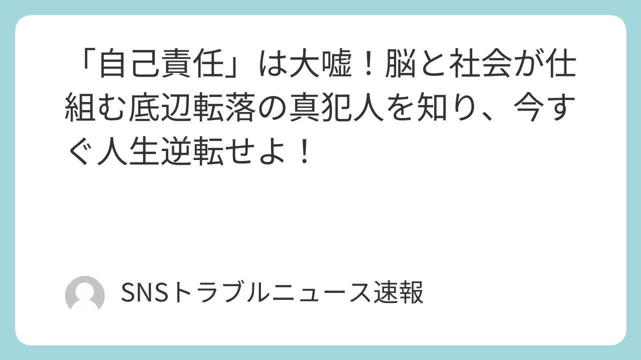 「社会の責任」を盾にして「自分の行動責任」を放棄してしまうと、結局、自分の人生のハンドルを他人に握らせてしまうことになります。誰かが助けてくれるのを待っているだけでは、あなたはいつまでたっても受動的なままで、自分の人生をコントロールする力を手に入れることはできません。