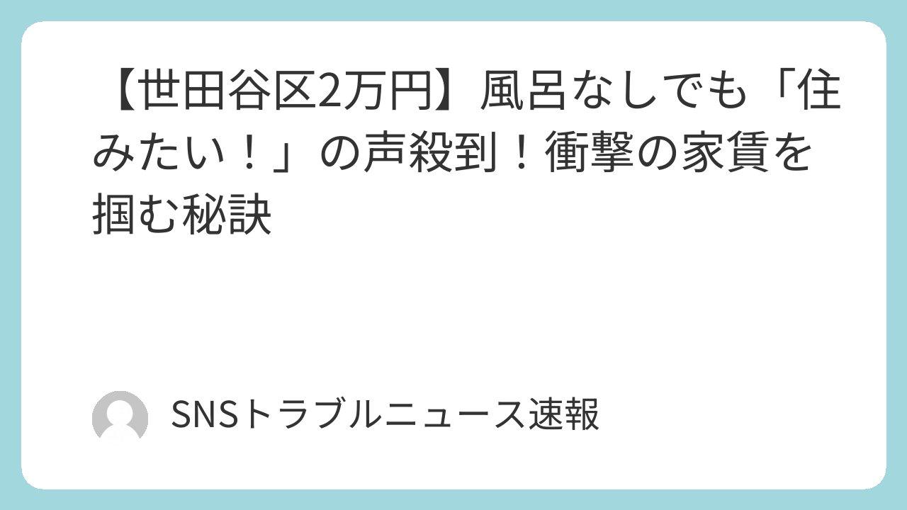 皆さん、こんにちは!今回は、SNSで大きな話題を呼んだ「世田谷区で家賃2万円(共益費込み)の物件に引っ越した」という投稿について、科学的な視点から深掘りしていきます。風呂なし、トイレ共同という条件ながら、月額固定3000円という驚異的な水光熱費、そして近隣の銭湯やフィットネスジムで生活を充実させるという投稿者さんの工夫。これらが、なぜこれほど多くの人々の心を掴んだのか?心理学、経済学、統計学といったサイエンスのレンズを通して、その魅力と背景にあるメカニズムを解き明かしていきましょう。