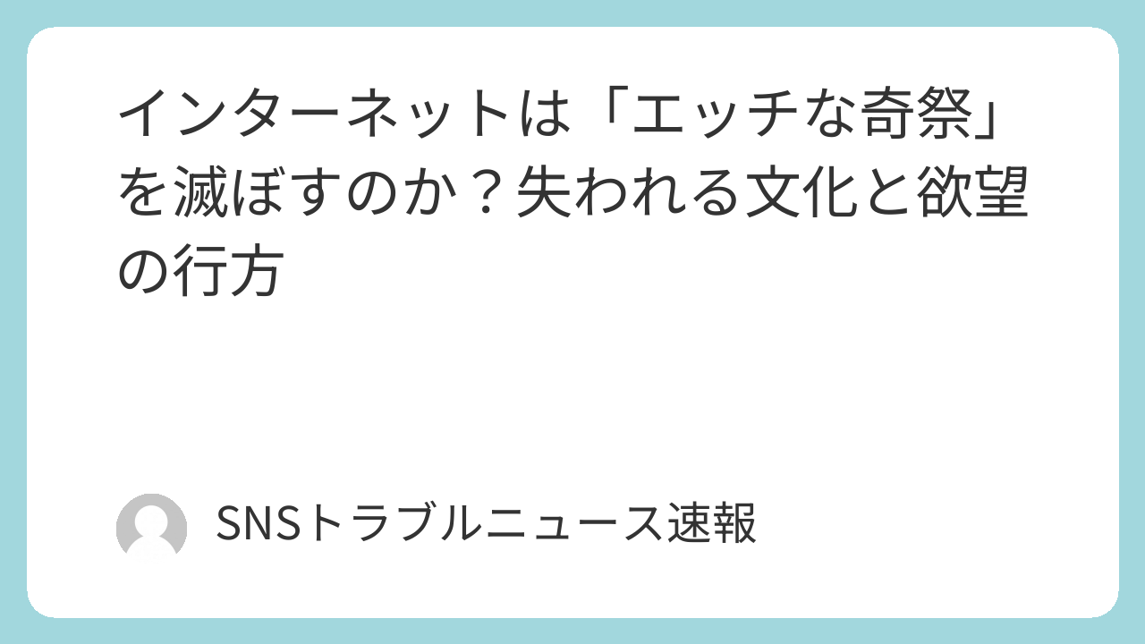 この議論の根底には、文化の「本質」と「表層」の乖離、そして「内向き」な価値観と「外向き」な情報伝達との間の緊張関係があります。心理学的に見れば、人間は未知のもの、タブー視されているもの、そして性的なものに対して強い好奇心を抱く傾向があります。インターネットは、その好奇心を容易に満たすことができるプラットフォームであり、特に秘匿性の高い文化にとっては、その好奇心の対象となることで、内実を伴わない消費に繋がるリスクを抱えています。